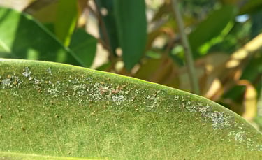 ใบเปลี่ยนสี: สังเกตดูถ้าใบเริ่มมีจุดด่างขาวๆ เล็กๆ กระจายอยู่ทั่วหน้าใบ จนดูเหมือนมีฝุ่นสีขาวหม่นๆ เกาะอยู่ (ภาษาชาวสวนเรียกใบขึ้นนวล) นั่นคือสัญญาณอันตราย