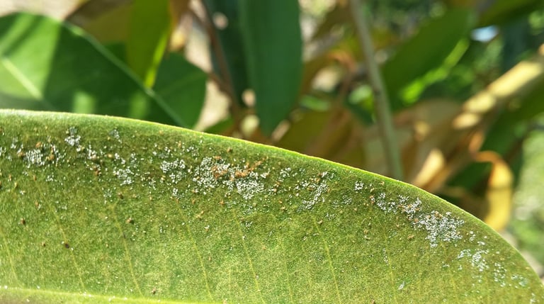 เช็กใต้ใบ: ถ้าไม่แน่ใจ ให้ลองใช้มือลูบใต้ใบ หรือใช้แว่นขยายส่องดู จะเห็นตัวเล็กๆ สีแดงวิ่งไปมา หรือมีคราบสีขาวและใยแมงมุมบางๆ เคลือบอยู่