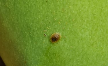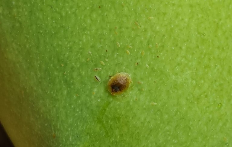 จะเกาะนิ่งอยู่ตามกิ่งหรือผล ดูเหมือนเกล็ดแข็งๆ หากพบไม่มากให้ใช้แปรงปัดออก