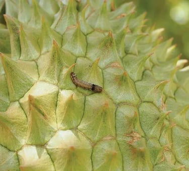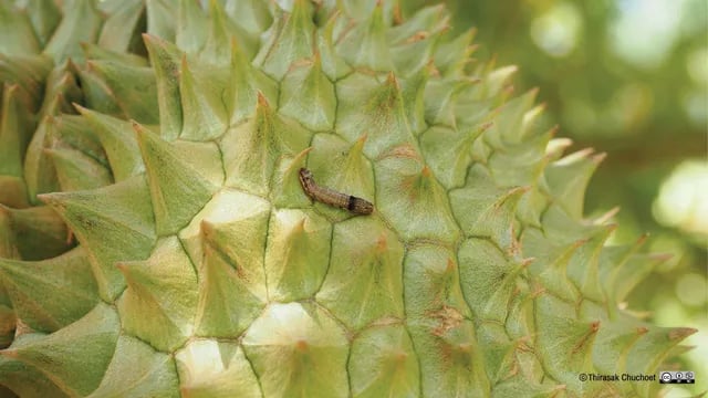 ตัวร้ายที่ทำให้ทุเรียนเสียคุณภาพ มักวางไข่ที่ผล การป้องกันที่ดีคือการ "ห่อผล" และคอยหมั่นตรวจดูรอยขุยตามเปลือกผล